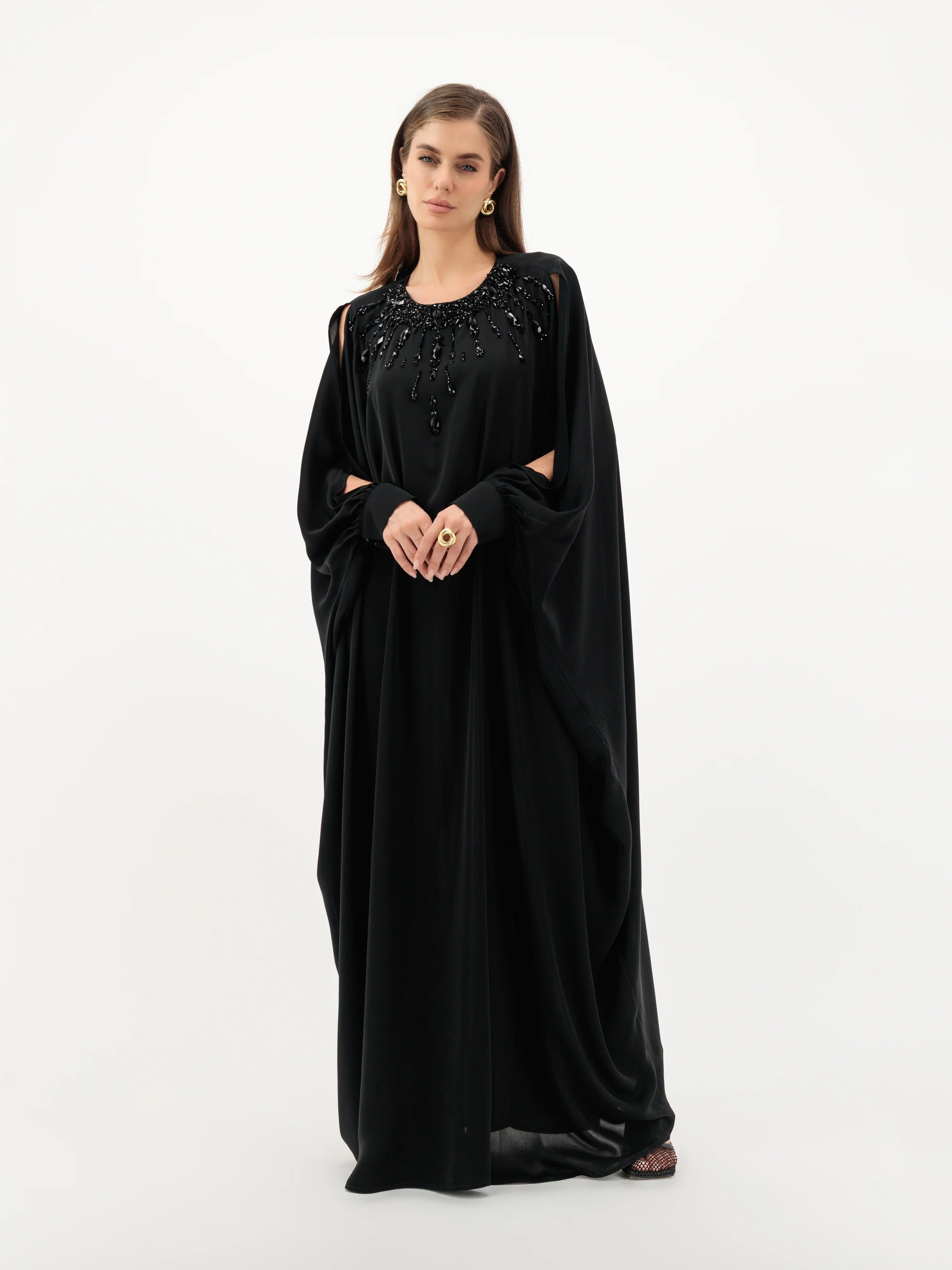 Kaftan dress with round neckline. Hand-embellished beaded detailing around the collar. Slit sleeves with cuffed finish. Back button closure. Flowing silhouette in soft crepe fabric.