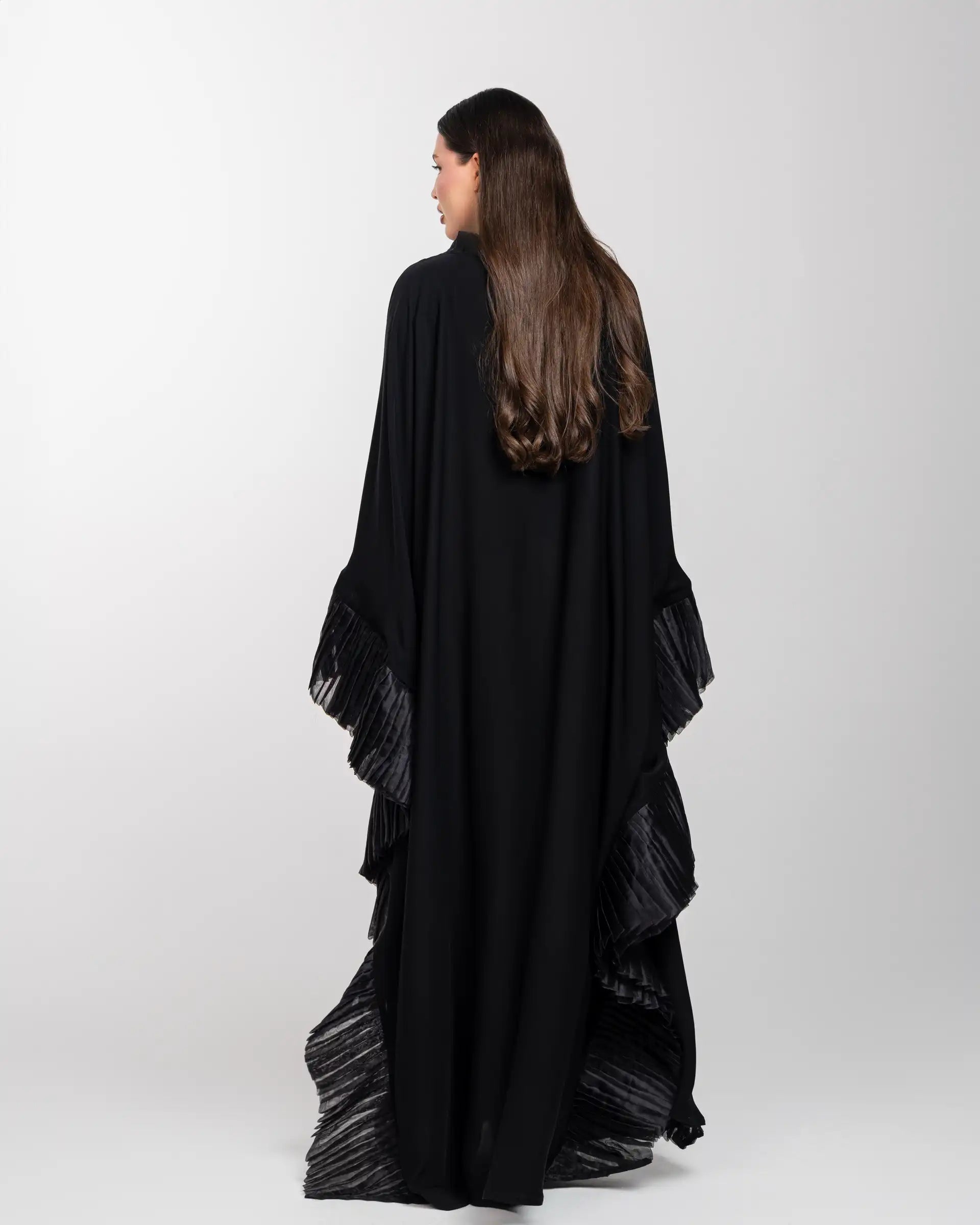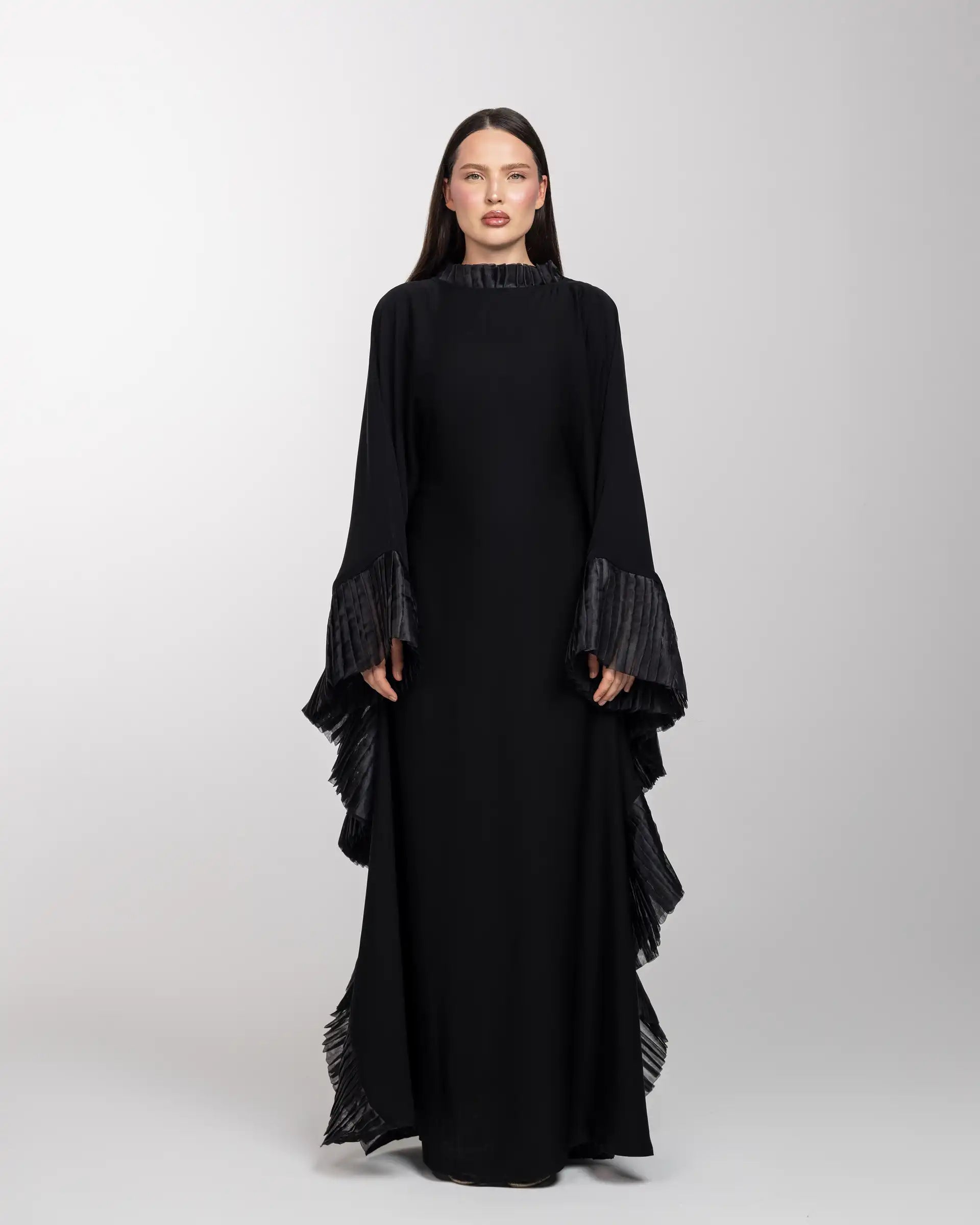 Maxi dress made of premium crepe fabric. High neckline trimmed with pleated satin. Long sleeves finished with wide pleated satin flounces. Matching pleated cascade panels at each side. Floor-length hem. Straight, relaxed silhouette; not tailored