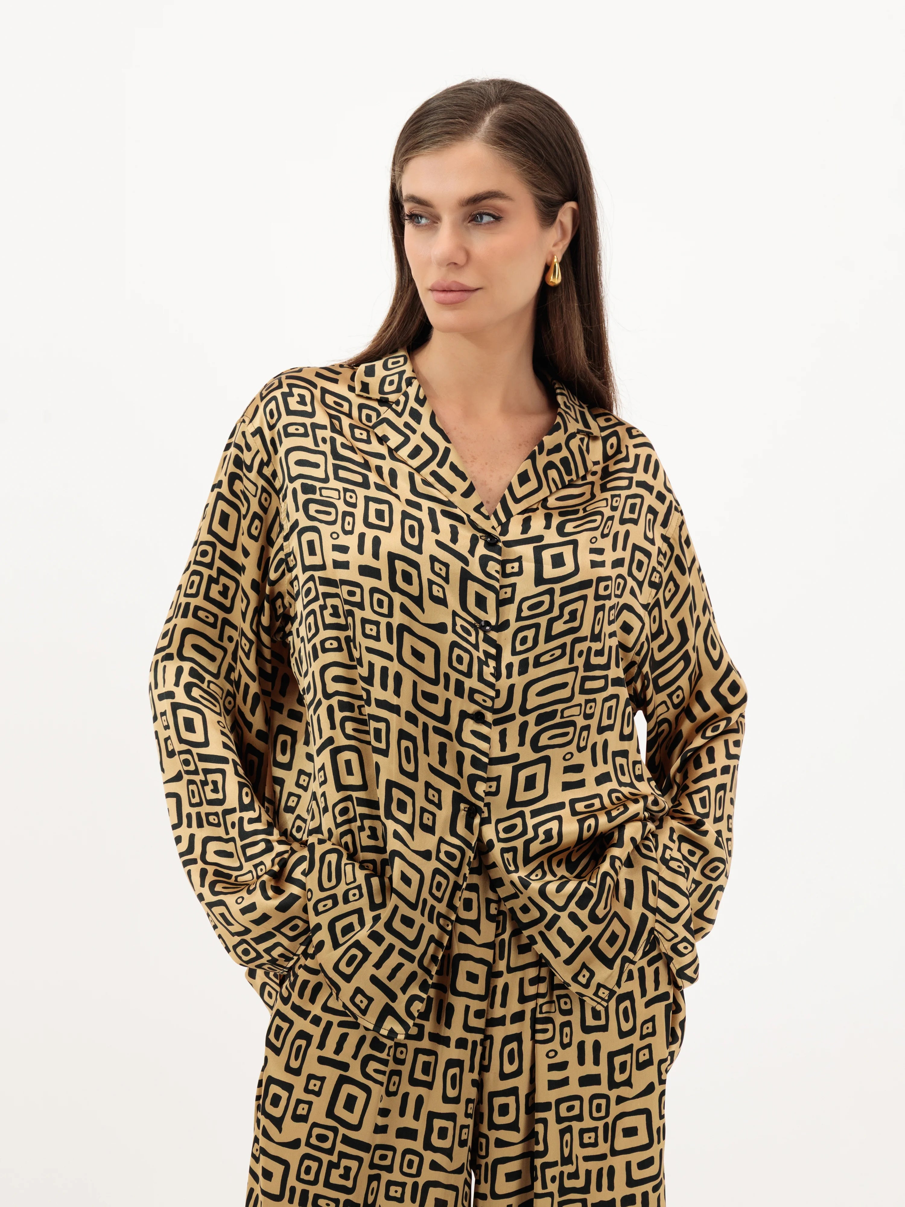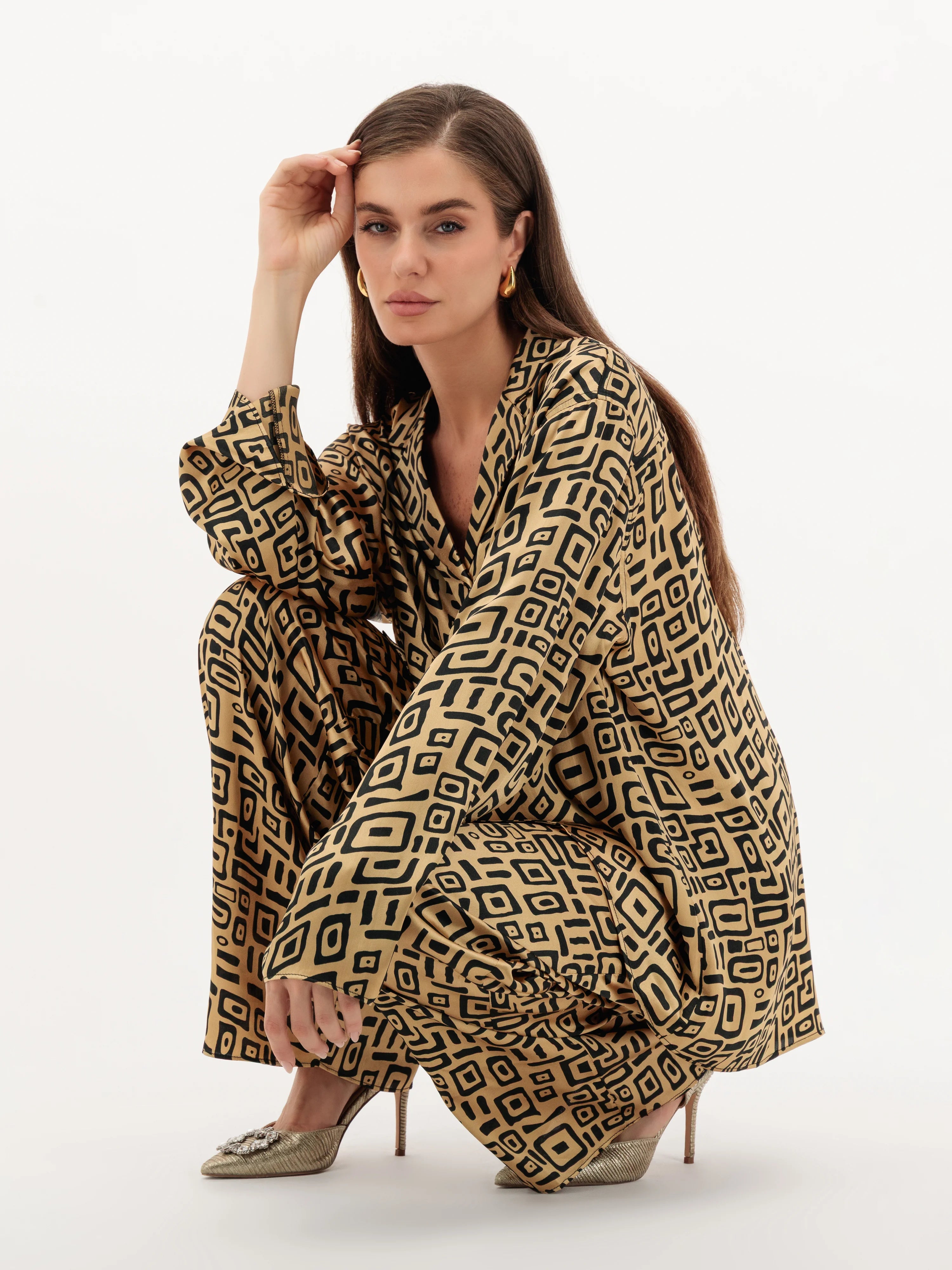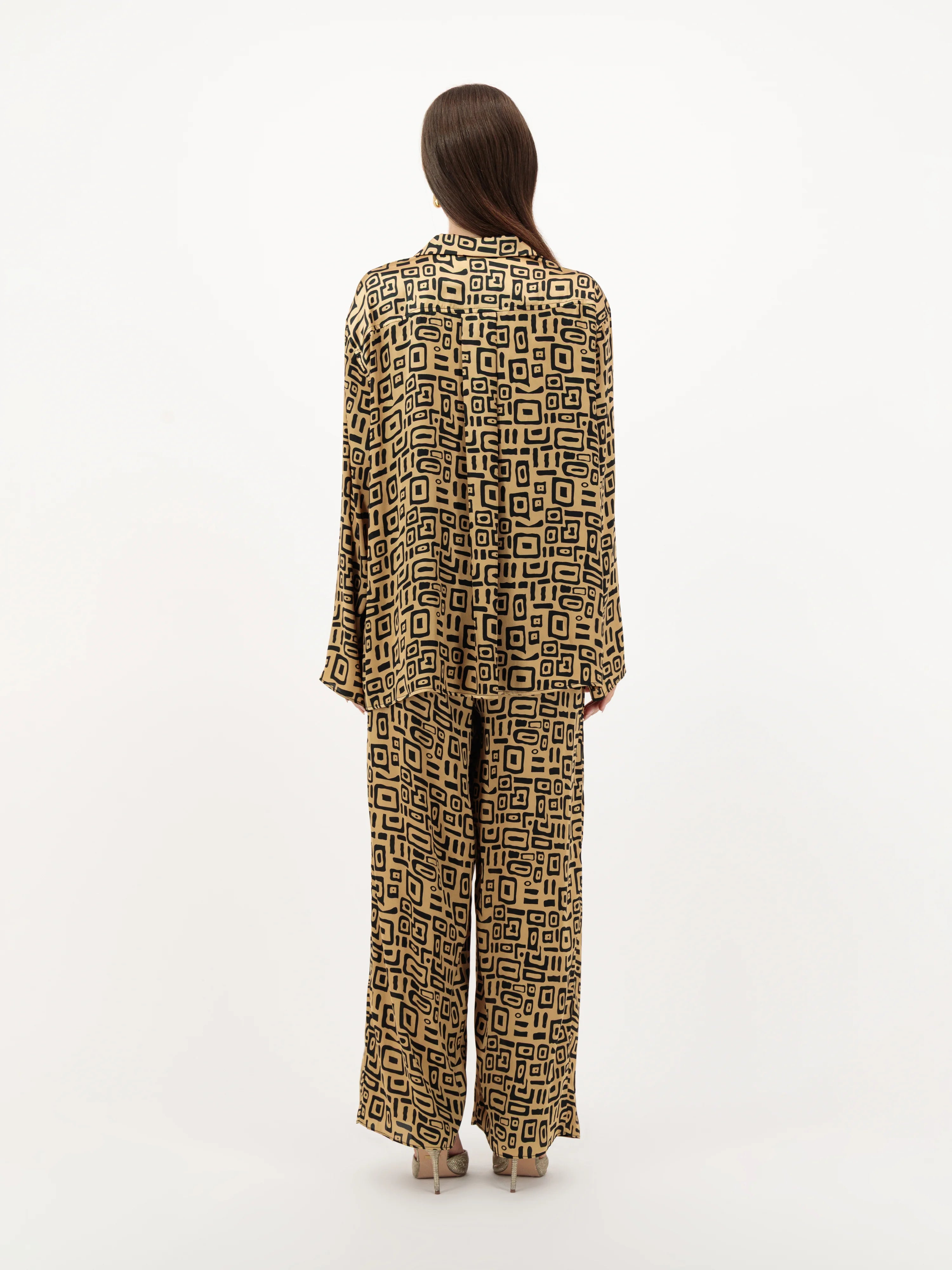 V-neck top with long sleeves. Geometric print. Soft satin fabric with a fluid finish. Relaxed silhouette. Matching wide-leg trousers. Full length.