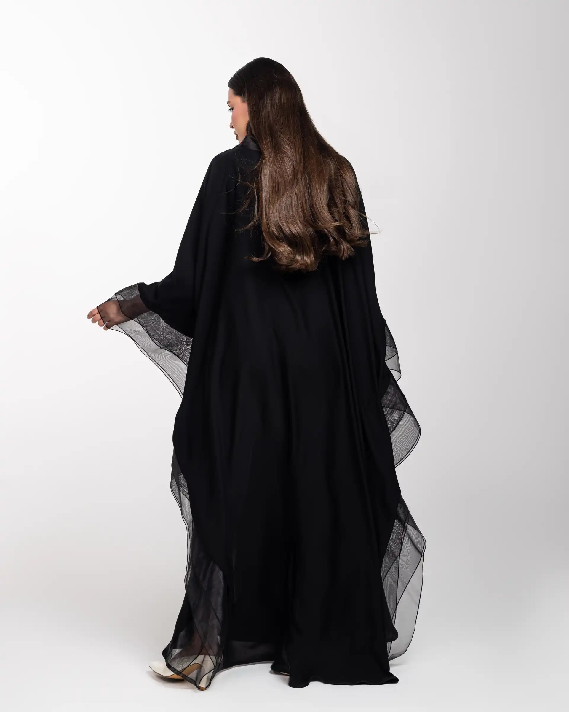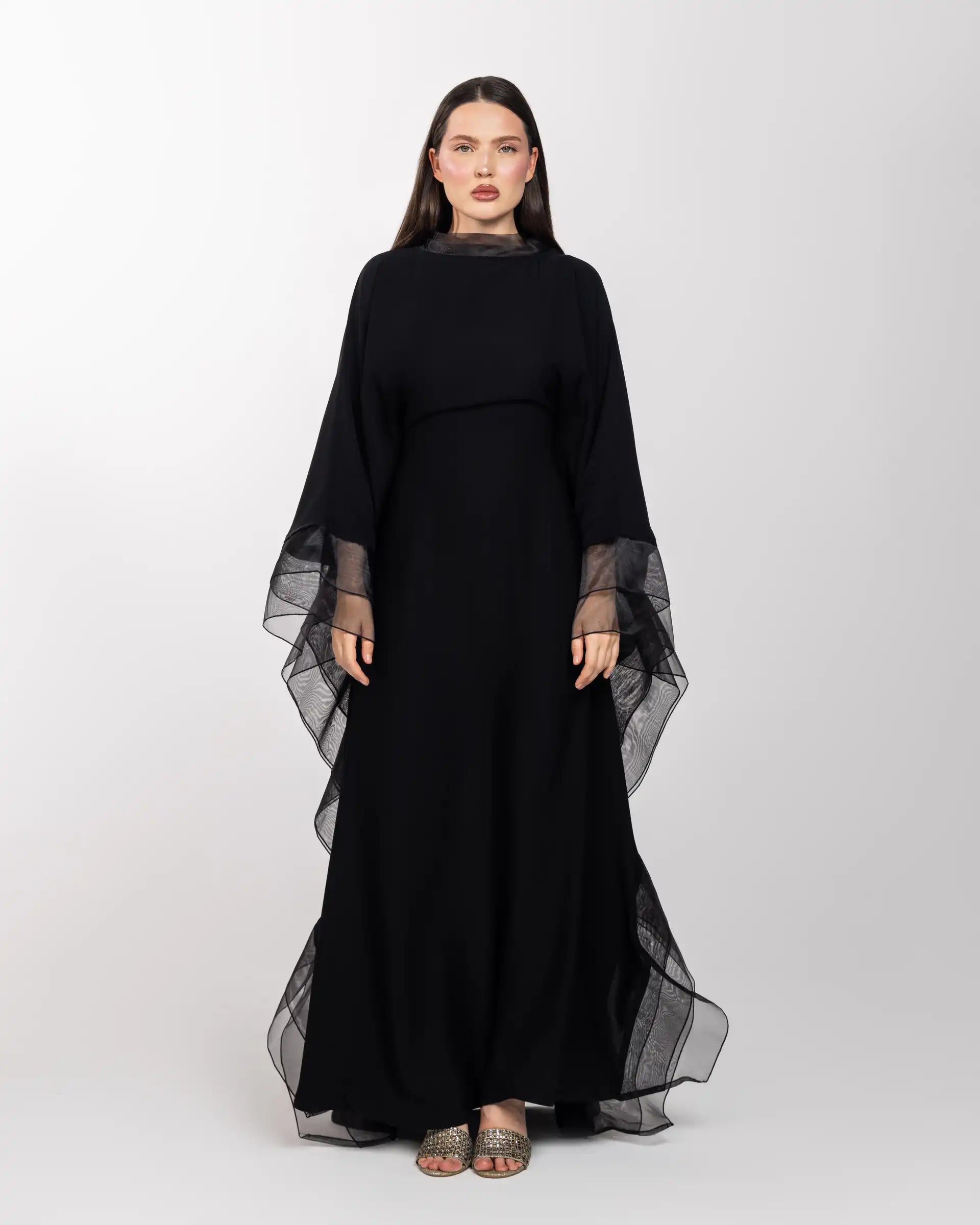 Maxi dress crafted from premium crepe fabric. High neckline with sheer organza trim. Long sleeves finished with tiered organza flounces. Matching organza cascade panels at each side. Full-length hem. Straight, relaxed silhouette; not tailored