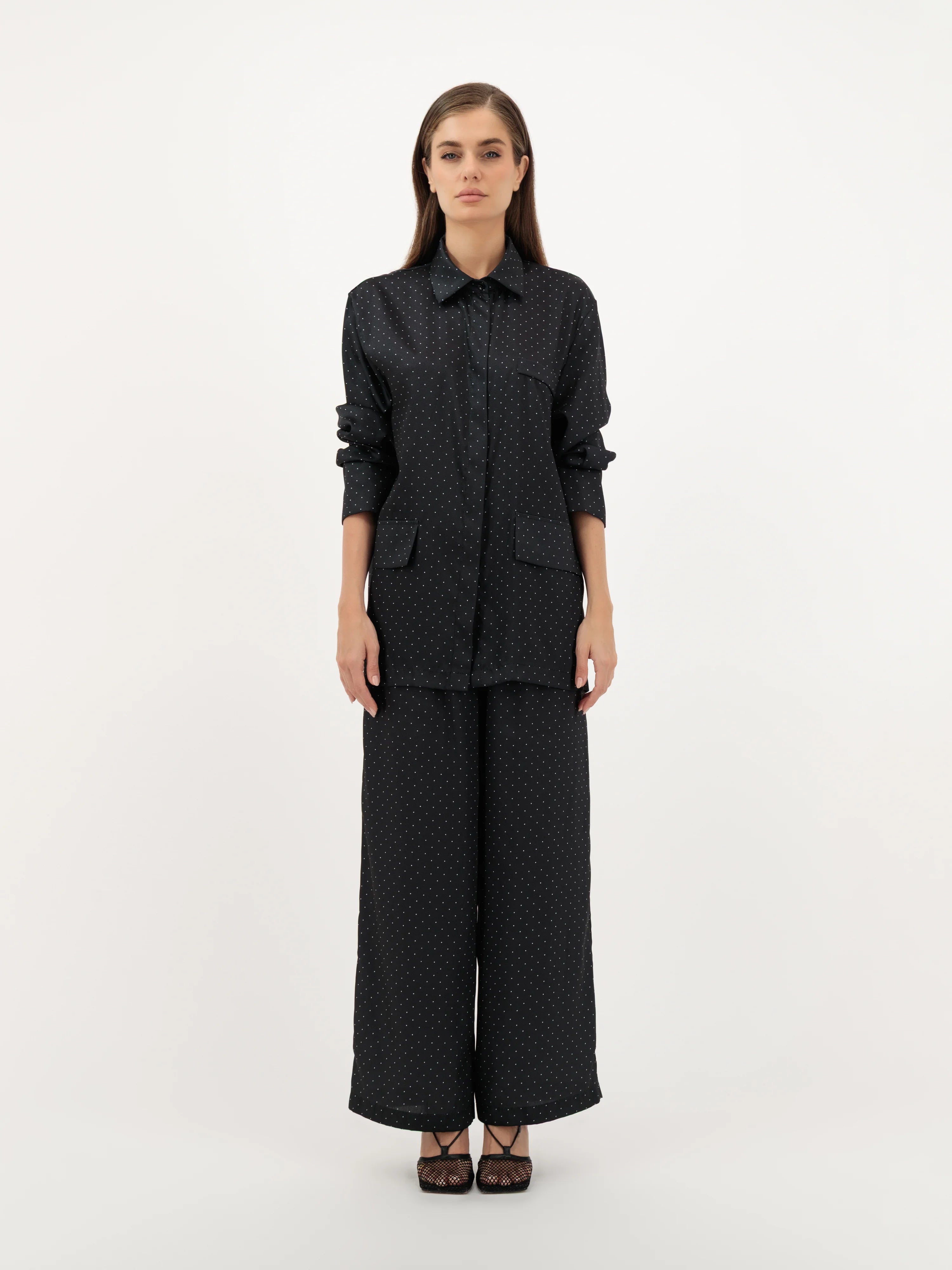Shirt with classic collar. Long sleeves. Front flap pockets. Polka dot print. Twill fabric. Relaxed, wide silhouette. Matching trousers with wide legs. Full length. Soft drape.
