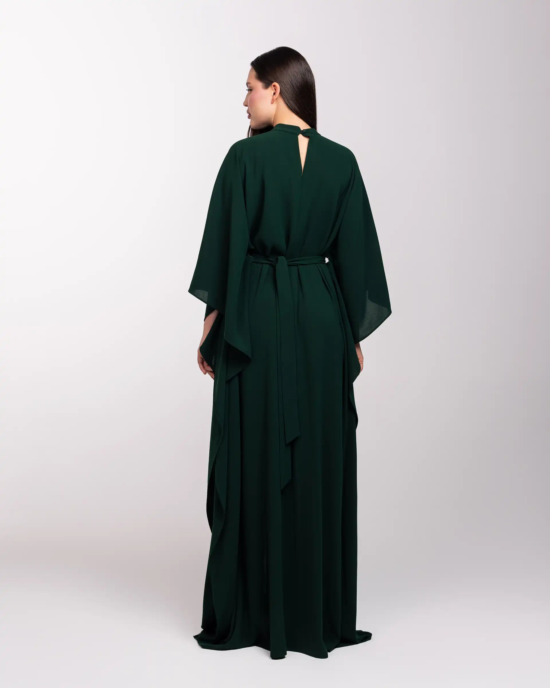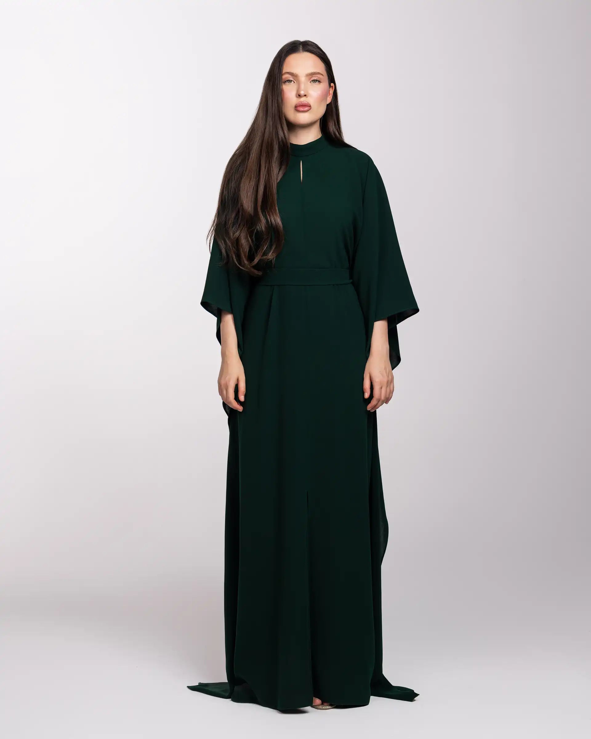 Square dress made of premium crepe fabric. Cut as a flat square for maximum drape. Stand collar with keyhole openings front and back. Wide kimono sleeves. Self-tie belt cinches the waist. Soft cascade panels at the sides. Center-front slit. Floor-length. Relaxed silhouette that can be shaped with the belt